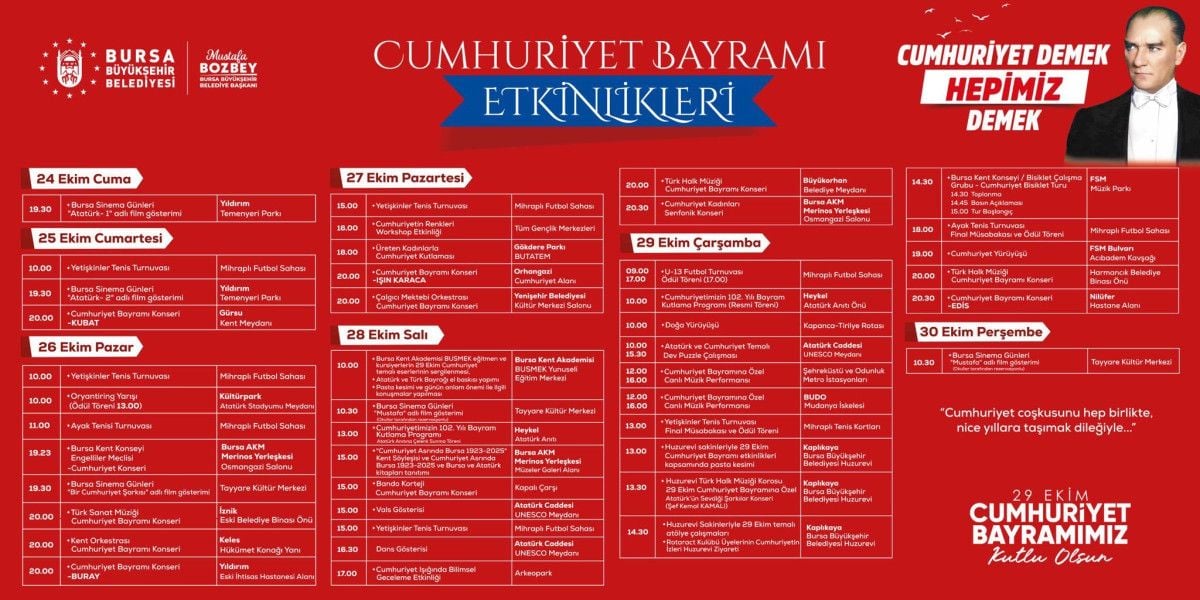 Bursa’da Büyükşehir Belediyesi, 29 Ekim Cumhuriyet Bayramı kutlamaları kapsamında 7 günde 10 konser düzenleneceğini duyurdu.