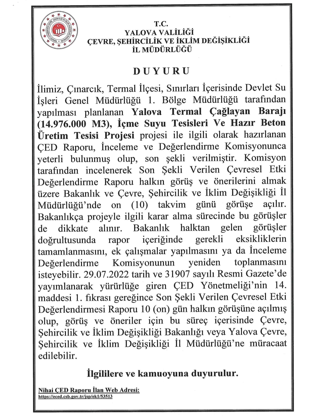 Yalova Valiliği Çevre, Şehircilik ve İklim Değişikliği İl Müdürlüğü’nün ilanına göre; DSİ Birinci Bölge Müdürlüğü’nün Çınarcık–Termal hattında planladığı “Yalova Termal Çağlayan Barajı (14 milyon 976 bin metreküp), İçme Suyu Tesisleri ve Hazır Beton Üretim Tesisi” projesinin ÇED Raporu, İnceleme-Değerlendirme Komisyonu tarafından yeterli bulunarak son şekli verildi.
