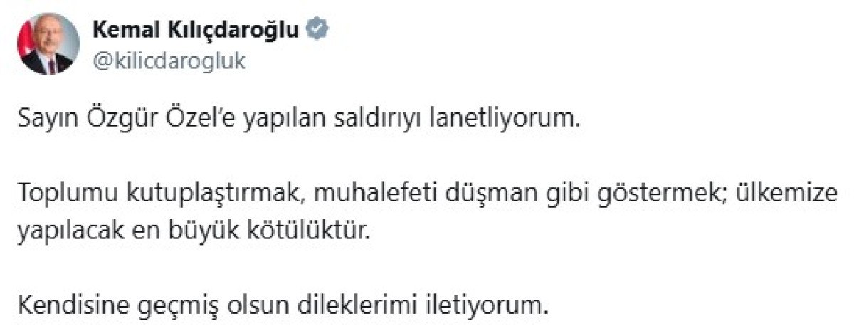 Sayın Özgür Özel’e yapılan saldırıyı lanetliyorum. Toplumu kutuplaştırmak, muhalefeti düşman gibi göstermek; ülkemize yapılacak en büyük kötülüktür. Kendisine geçmiş olsun dileklerimi iletiyorum.