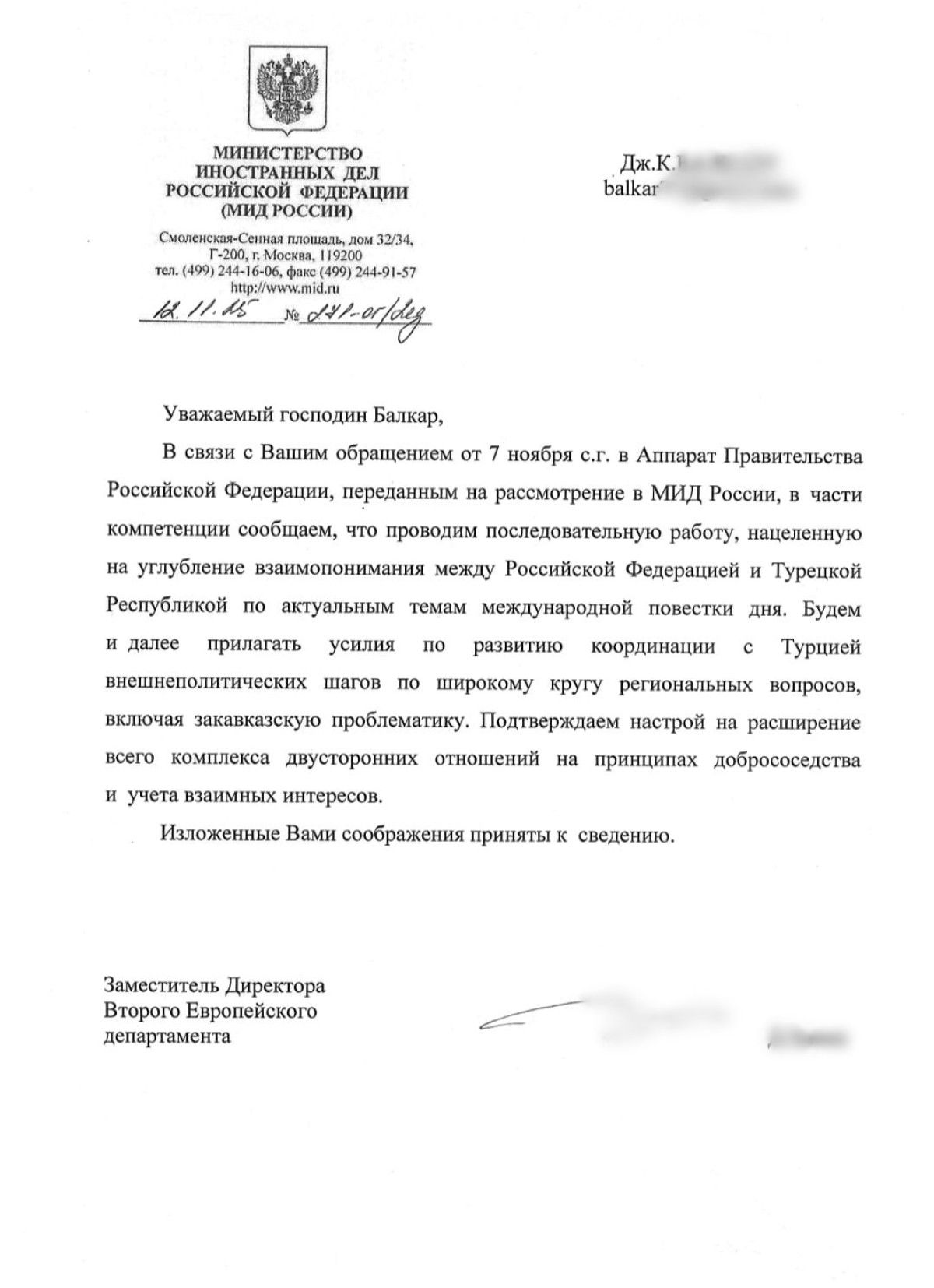 Balkar, Zaharova’nın sözlerinin hem tarihsel olarak yanlış olduğunu hem de Türk-Rus ilişkilerine zarar verebileceğini belirterek Kremlin’e bir yazı gönderdi. Rus makamları ise yazıya kısa sürede dönüş yaptı.