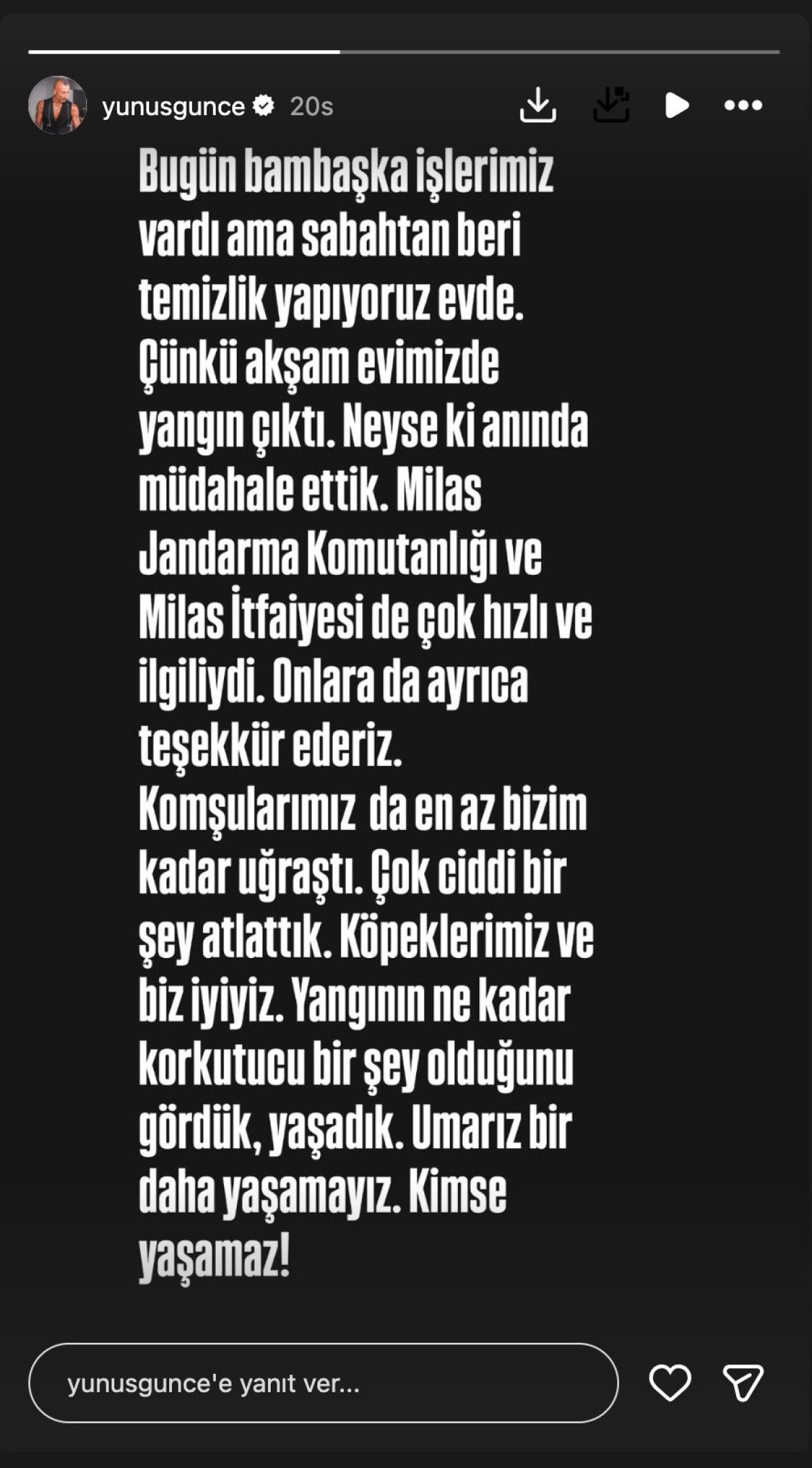 Ünlü isim, eşiyle beraber ciddi bir kaza atlattıklarını açıkladı. Evlerinde yangın çıktığını söyleyen Yunus Günçe, şu ifadeleri kullandı: "Bugün bambaşka işlerimiz vardı ama sabahtan beri temizlik yapıyoruz evde. Çünkü akşam evimizde yangın çıktı. Neyse ki anında müdahale ettik. Milas Jandarma Komutanlığı ve Milas İtfaiyesi de çok hızlı ve ilgiydi. Onlara da ayrıca teşekkür ederiz.