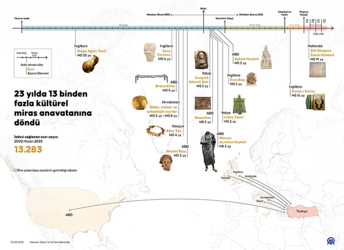 2002-2025 yılları arasında 13 bin 283 kültür varlığının Türkiye'ye iadesi sağlandı. Bu eserlerden 1149'u geçen yıl, 15'i bu yıl ana vatanına geri döndü. 2018-2025 yıllarında ise toplam 8 bin 968 eser ülkeye kazandırılmış oldu.