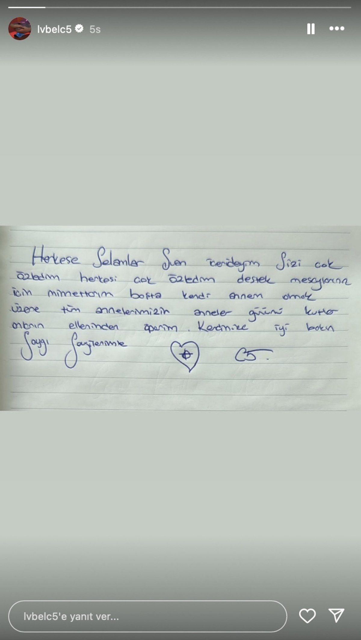 Lvbel C5 mektubunda, 'Herkese selamlar, şu an içerideyim. Sizi çok özledim, herkesi çok özledim. Destek mesajlarınız için minnettarım. Başta kendi annem olmak üzere tüm annelerimizin Anneler Günü'nü kutlar, onların ellerinden öperim. Kendinize iyi bakın, saygı ve sevgilerimle' ifadelerini kullandı.