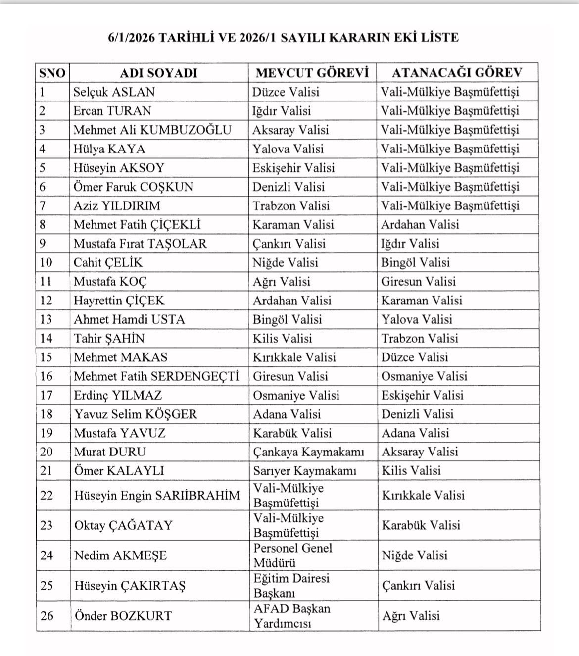 Valiler Değişti işte tam liste