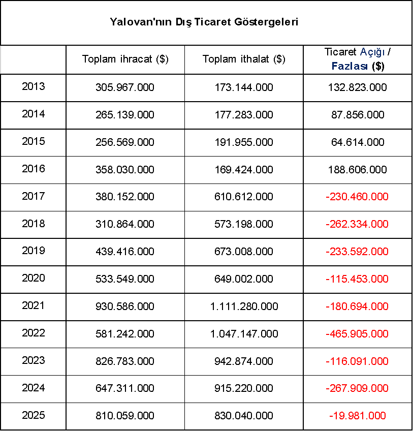Yalova bugün de üretmeye devam ediyor. Ancak ithal girdiye dayalı üretim yapısı, döviz kurundaki her oynaklığı doğrudan maliyete yansıtıyor. Üretim artıyor, emek veriliyor; ancak kur şokları ve maliyet baskısı ihracat performansını istikrarlı bir çizgide tutmayı zorlaştırıyor. Son yıllardaki ithalat verileri de bize bu gerçeği göstermektedir.