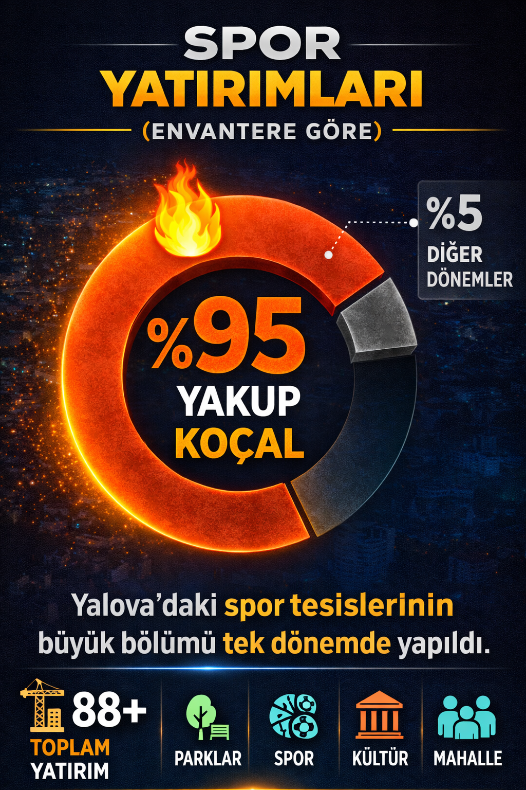 Yüzme havuzları, tenis kortları, güreş merkezi ve mahalle spor sahaları dahil olmak üzere spor yatırımlarının yaklaşık %95’i Yakup Koçal döneminde gerçekleştirildi.